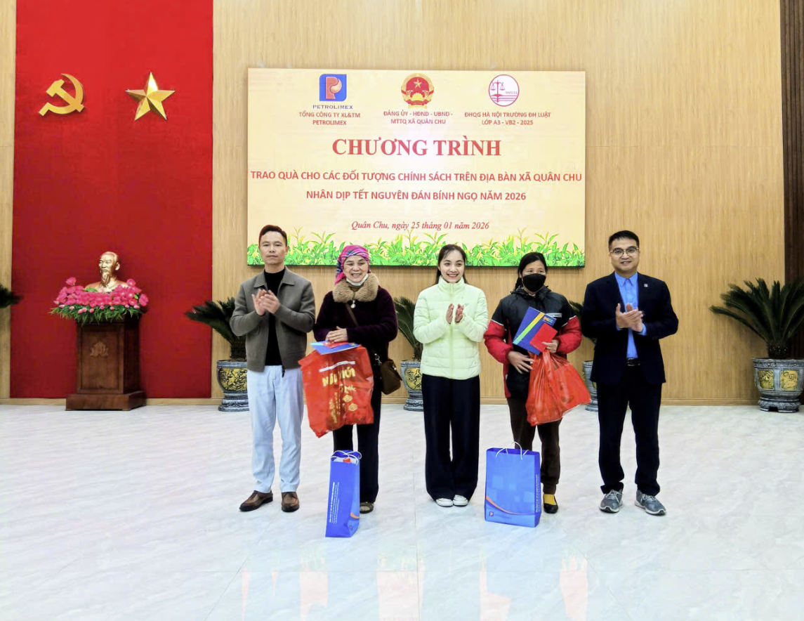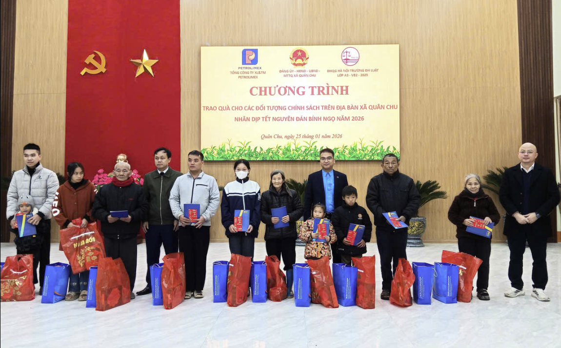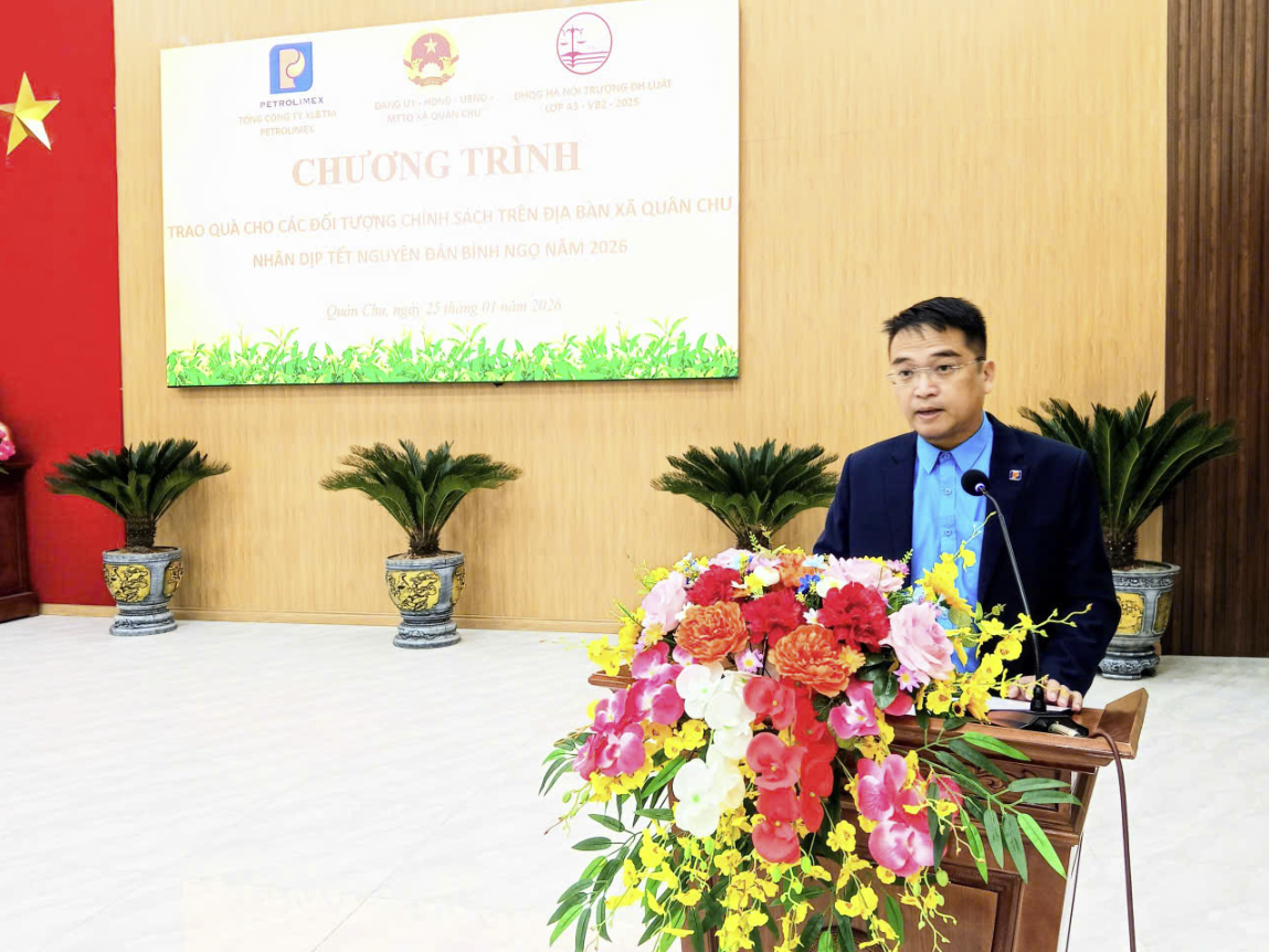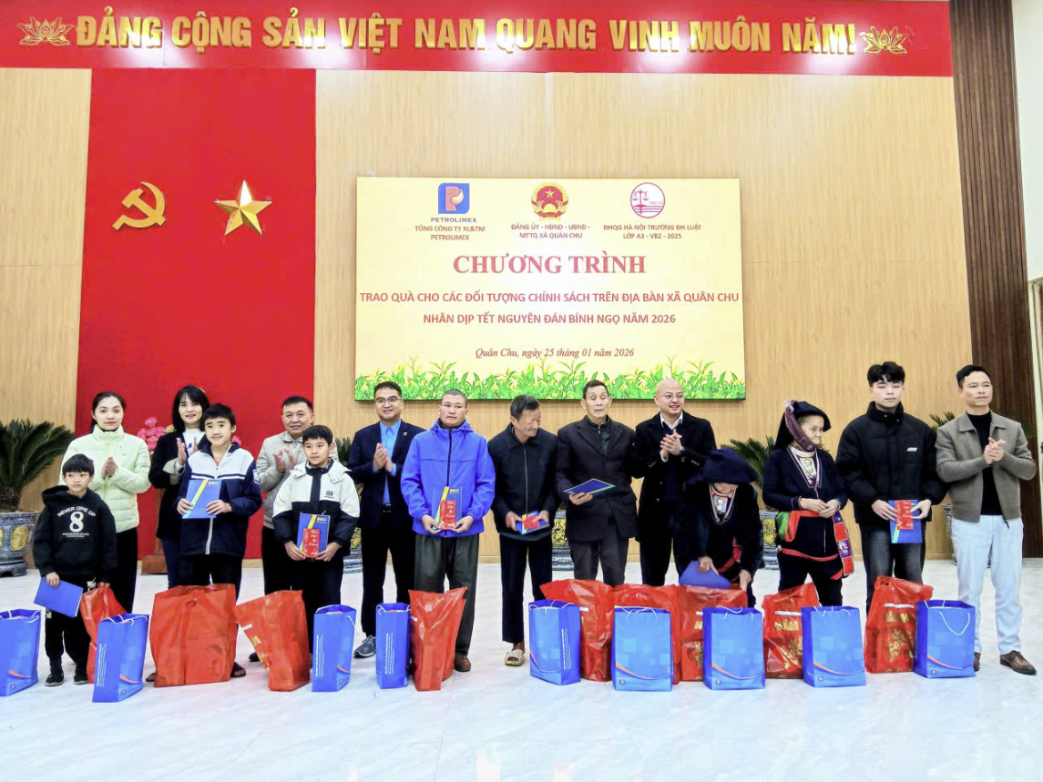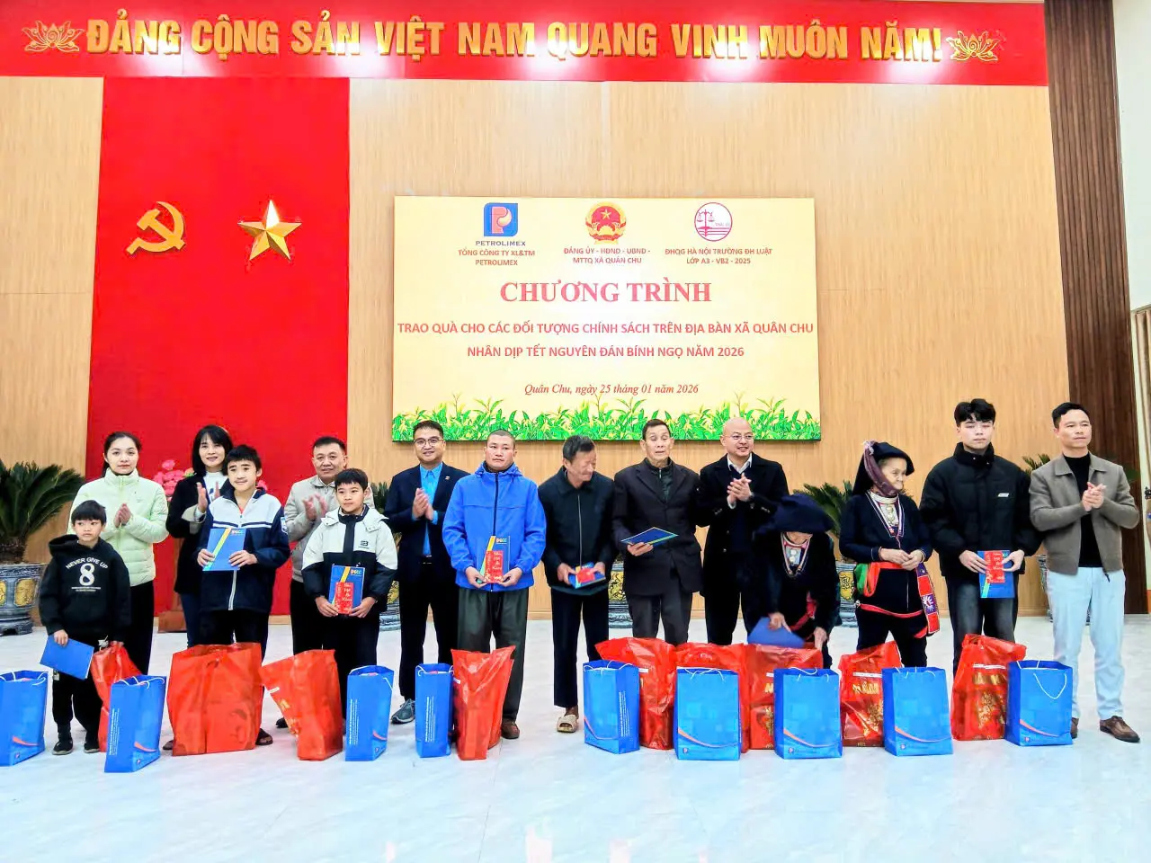 Sáng ngày 25/01/2026, Tại hội trường Nhà văn hoá thể thao xã Quân Chu, Công đoàn Tổng công ty Xây lắp và Thương mại Petrolimex phối hợp với Đảng ủy, Chính quyền, MTTQ xã Quân Chu tổ chức chương trình tặng quà cho các đối tượng chính sách và các cháu học sinh có hoàn cảnh khó khăn trên địa bàn nhân dịp Tết Nguyên Đán Bính Ngọ năm 2026.