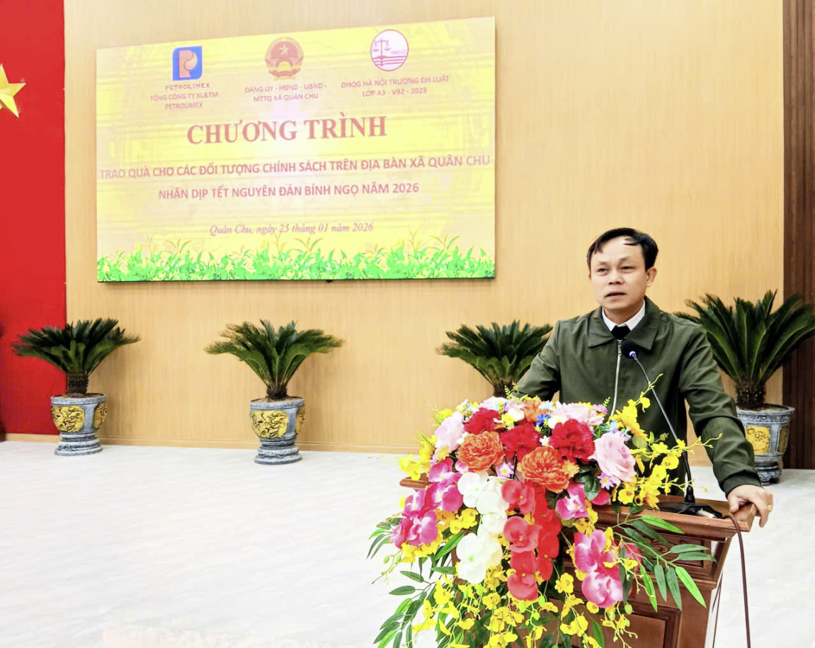 Phát biểu tại chương trình, đồng chí Đặng Lê Ninh – PBT Đảng uỷ, Chủ tịch UBND xã Quân Chu đã bày tỏ sự cảm ơn chân thành trước sự quan tâm, hỗ trợ đầy nghĩa tình của Tổng công ty Xây lắp và Thương mại Petrolimex đối với người dân địa phương.